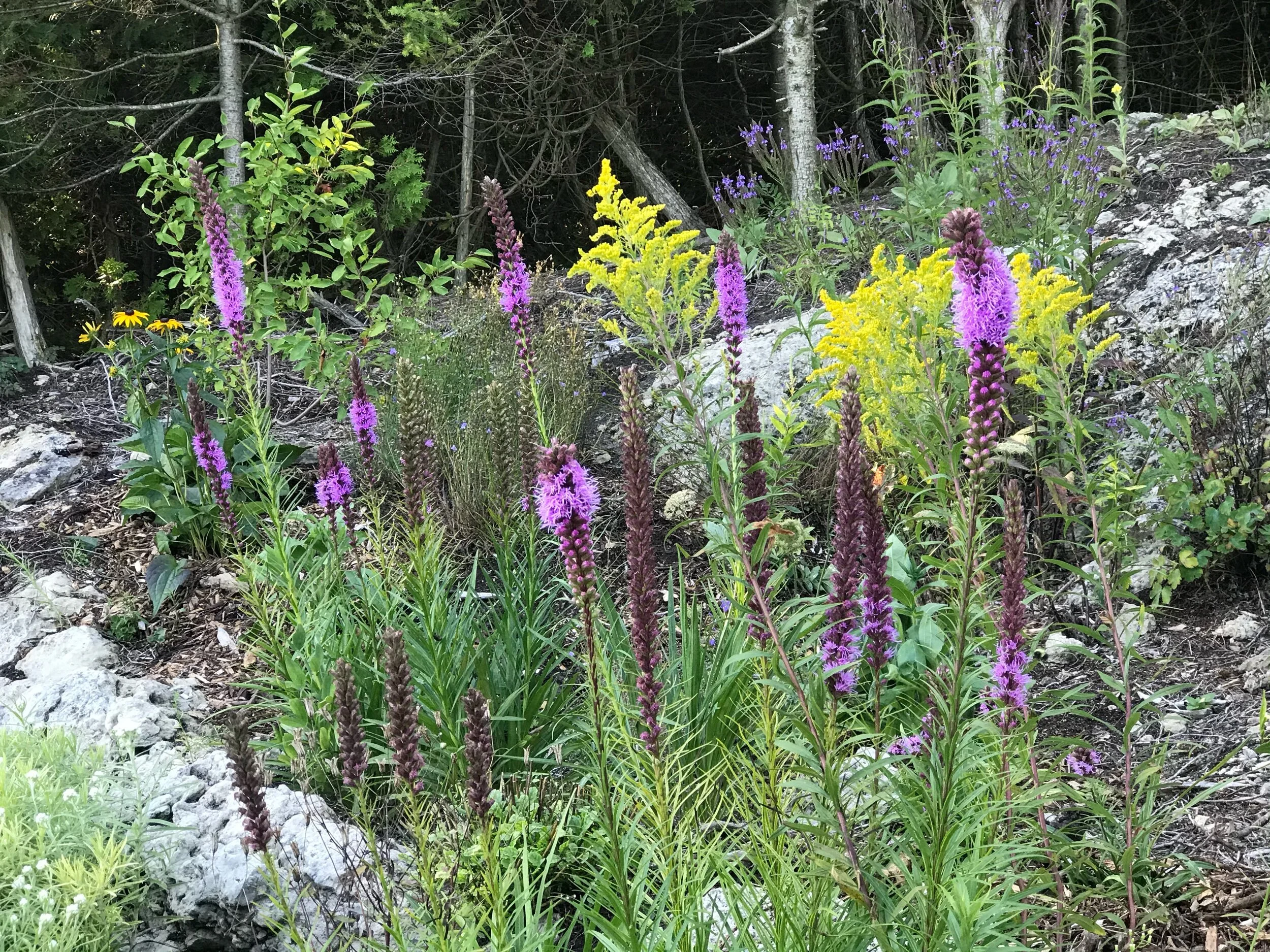 Early summer saw an actual sea of oxe eye daisies show up as the sweet peas started to bloom. As summer pushed on the liatris tapered off but the vervain and coneflower kept on giving. Then just in time for fall, the asters exploded and kept blooming and blooming for over a month. At all times there were dozens of bees of multiple varieties clinging to them doing their thing, so I added more native varieties because late pollinator friendly plants are essential.
