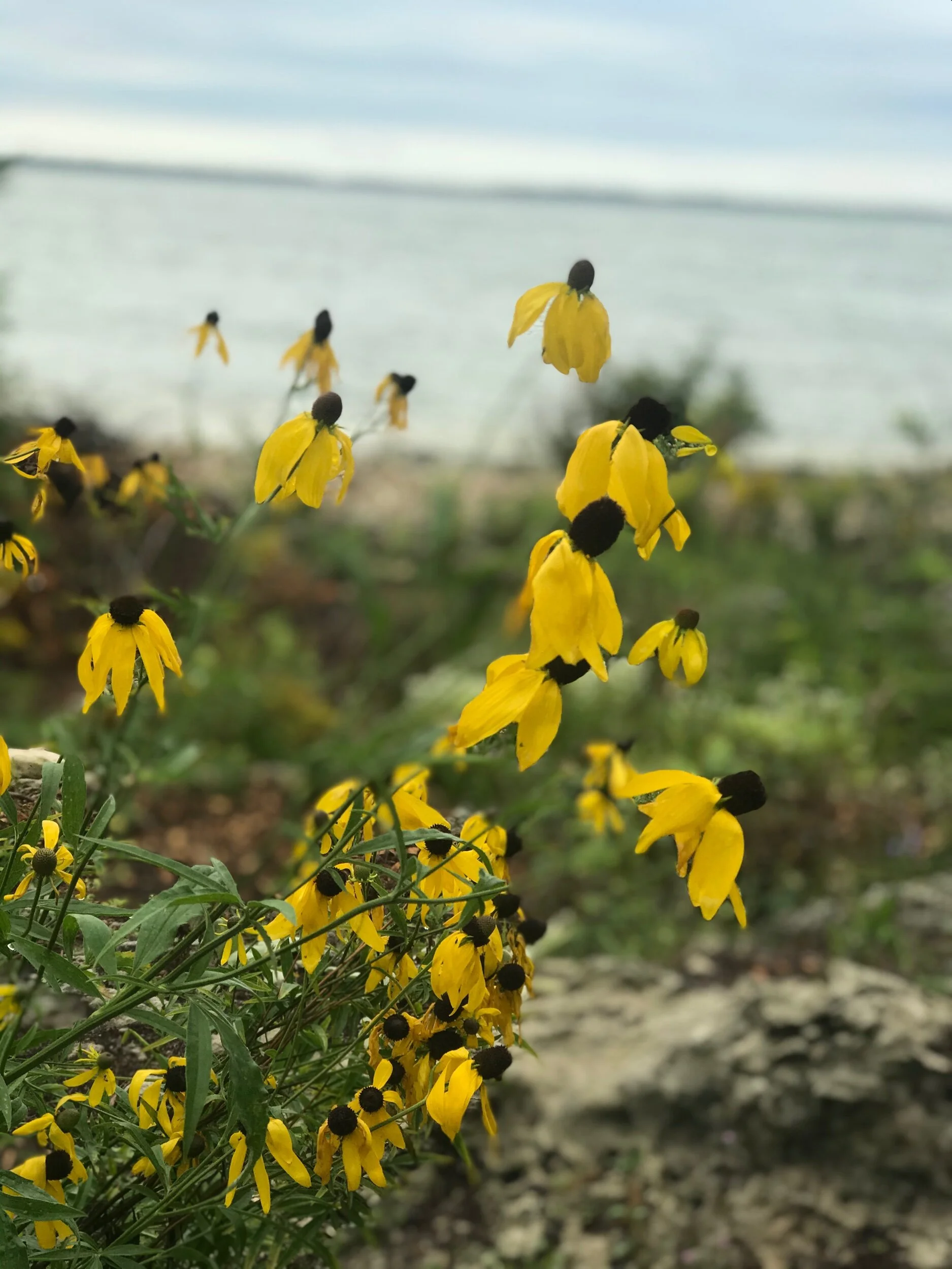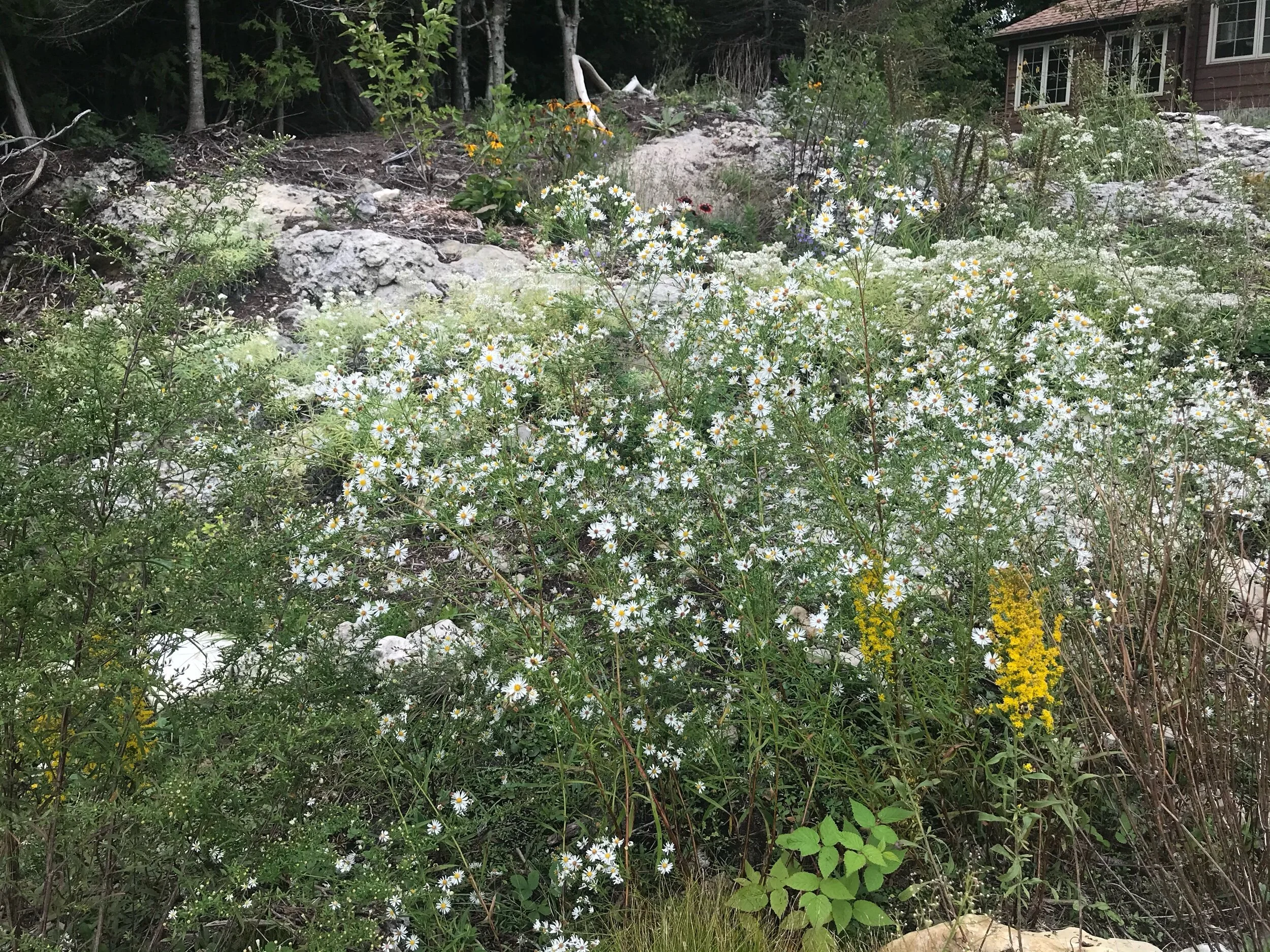Above in year one: hoary vervain, pearly everlasting, yarrow are all plants that I added that are native to the island. The sweet pea that was already there really took off now that it had all the room to move. This was all a testament to working with nature and not competing with it.