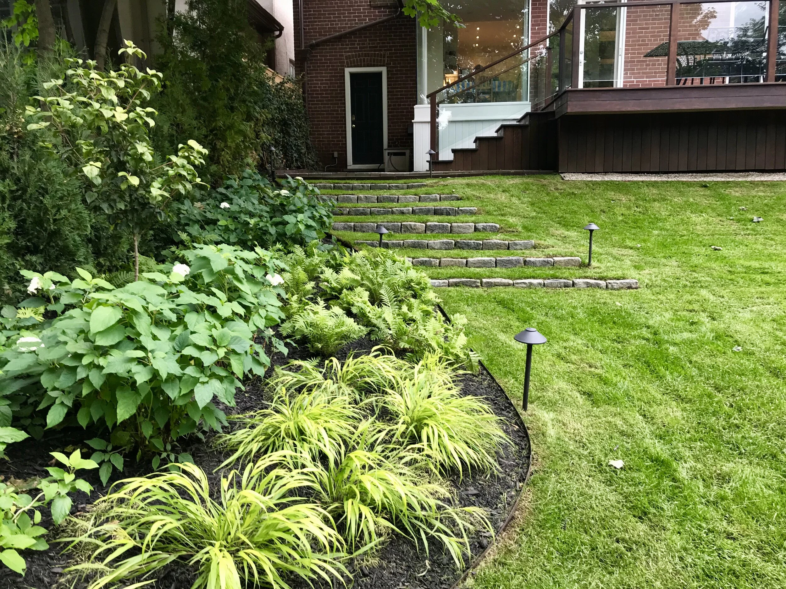 There are a lot of elements of this design that are not visible on the final result, which include a drip line and spray head irrigation system, gas lines as well as french drains - all elements that end up being so crucial to a successful design but are rarely promoted. The visible aspects are pictured here in year 1 of growth. Keep scrolling to see these, along with “before” and construction photos.